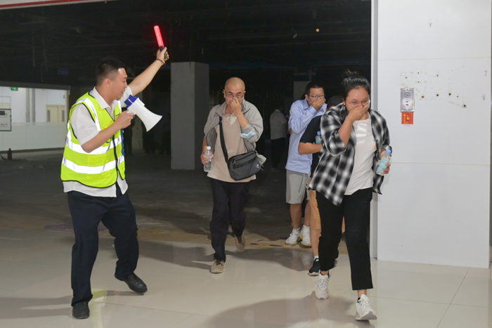 園區模擬突發火情。在第一時間發現“火情”后,園區立即啟動應急預案,組織撲滅初期火情,組織人員疏散。整個過程訓練有素,專業化程度高。