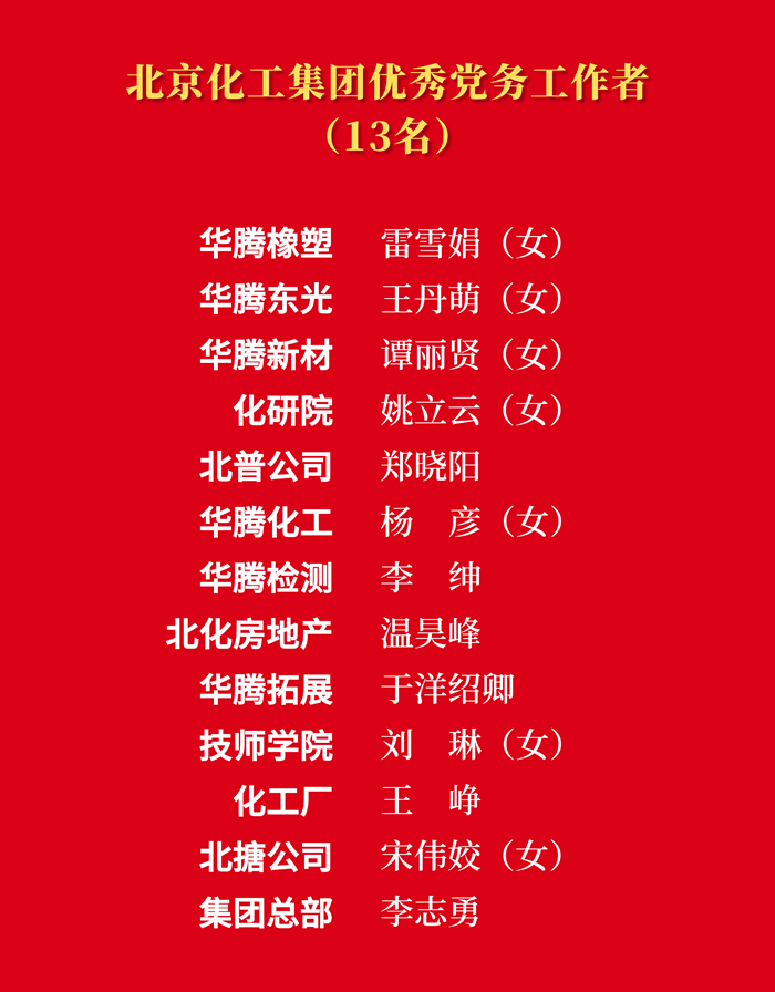 為熱烈慶祝中國共產(chǎn)黨成立103周年,大力表彰在推進(jìn)“十四五”規(guī)劃、推動集團“231”戰(zhàn)略布局、完成重點工作任務(wù)等各方面涌現(xiàn)出來的先進(jìn)集體和先進(jìn)個人,市國資委黨委決定,授予北搪黨委“先進(jìn)基層黨組織”稱號,授予技師學(xué)院姜洪強“優(yōu)秀共產(chǎn)黨員”稱號,授予北京化工集團總部李志勇“優(yōu)秀黨務(wù)工作者”稱號;北京化工集團黨委決定,授予14個黨支部“先進(jìn)基層黨支部”稱號,授予29名同志“優(yōu)秀共產(chǎn)黨員”稱號,授予13名同志“優(yōu)秀黨務(wù)工作者”稱號。