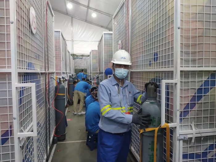 根據指令,6月30日凌晨4點開始灌裝氣球。為了精準對接氣球“灌滿”100個特制移動籠房的任務,北普公司領導小組將全部人員分成了8個工作小組,每個小組由3人組成,組長都是由一名曾經參加過“9.3閱兵”和“新中國成立70周年慶典”保障任務的老員工擔任,每個小組對接12-16個籠房。他們的任務是在規定的時間內將鋼瓶推放并綁定在指定位置,裝表、聯管、上槍、調壓,充氣作業開始以后還不停地巡視、加壓、換瓶,目標只有一個,配合協作單位在規定的1個半小時時間內,罐裝好10萬只氣球。氣球充好以后,還要以最安全的方式、最快的速度將現場300多支高純氦氣鋼瓶撤出,確保100個特制移動籠房能夠準時出發。