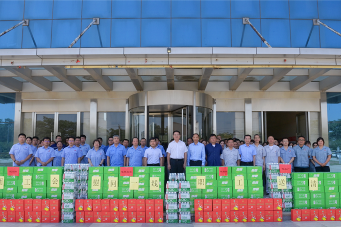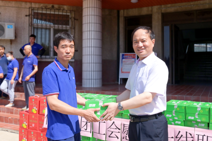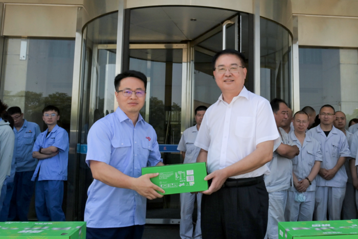 王國(guó)華詳細(xì)詢(xún)問(wèn)了大家的工作狀況、身體情況,再三囑咐大家要?jiǎng)谝萁Y(jié)合,嚴(yán)格遵守各項(xiàng)操作規(guī)范,保證自身安全,并將防暑降溫飲品親手送至一線(xiàn)職工,開(kāi)啟了集團(tuán)2023年度夏季“送清涼”活動(dòng)。