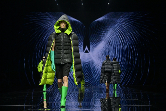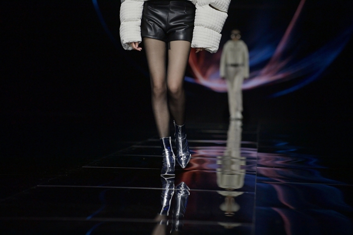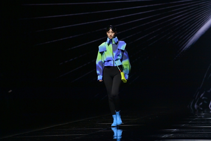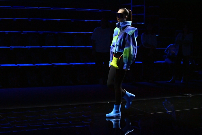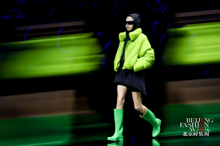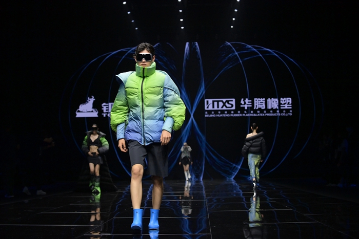 整個秀場,靚麗前衛的膠靴或踏于足下,或成為時尚新品挎于體側,伴著強勁的樂曲,綻放出化工科技在時尚前沿的另類美學。