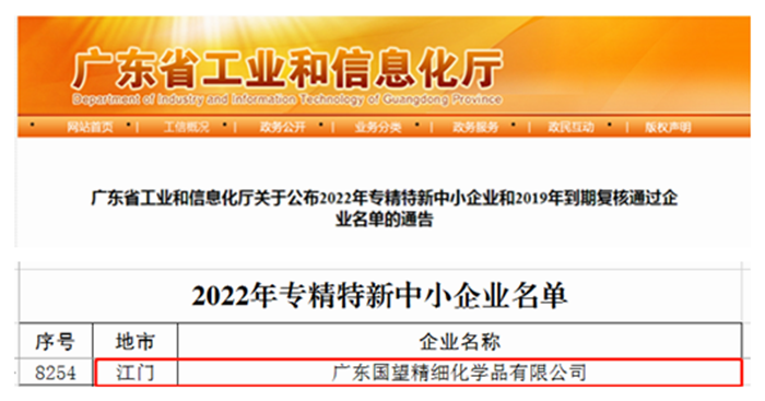 春節(jié)前夕,從廣東傳來好消息,華騰新材所屬廣東國望精細(xì)化學(xué)品有限公司成功入選廣東省2022年“專精特新”中小企業(yè)名單,成為北京化工集團(tuán)第6家“專精特新”企業(yè)。